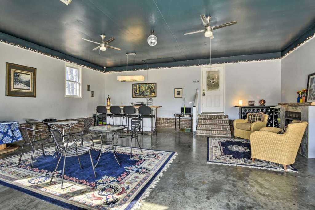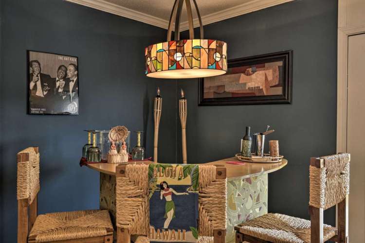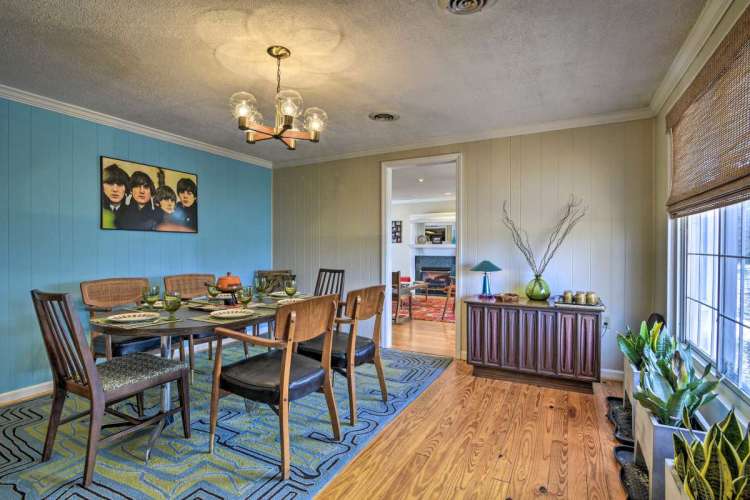 The home offers a modern kitchen, completely stocked with cooking equipment and vintage dishes and tableware, a 1968 Hi-Fi stereo with all your favorite Beatles albums while serving cocktails from the Tiki bar. There’s an expansive outdoor grill and island counter, and the garage has been converted into a spacious bar (The Branch Water Lounge) with a massive 8-foot bar and fireplace.